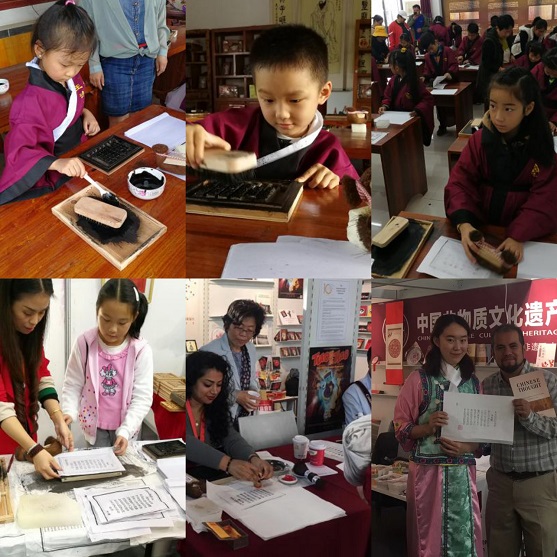 学员统一身穿汉服用木活字印制作品,服装和工具由主办方现场提供: