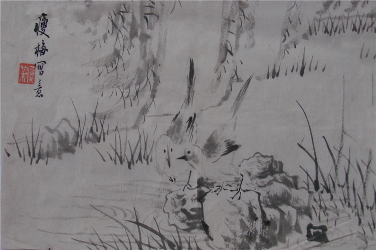 花鸟册页·春意图—纸质,内容为山间小溪边的石头上立一对小鸟,低首翘尾,侧身作窃窃私语状。溪边小草与其应和。全景采用墨笔写意。落款行书“瘦梅写意”。钤印白文“瘦梅”。