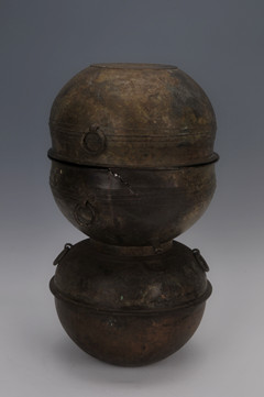 由釜、甑、盆套合组成。上层盆:侈口外折宽口沿,深腹下收,平底。腹部有弦纹,两侧有对称的铺首衔环。中层甑:侈口外折宽口沿,深腹下收,腹有弦纹,两侧有对称的铺首衔环。下有圈足,底部有箅形隔,箅以十字均分为四个扇形区域,分别镂刻平行的线形透孔,相邻区域的透孔方向呈九十度。底侧有一流。下层釜:直口,鼓腹,平底。上腹两侧有对称的铺首衔环,在腹中部有一道凸起弦棱。