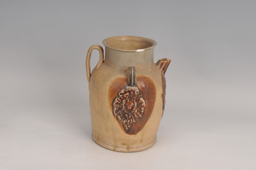 侈沿,直阔颈,溜肩,腹壁斜直,平底。通体施青釉,釉色青中略显灰黄。肩、腹处模印褐色贴花三朵,肩部两系,一流,一提鋬,壶身有三朵褐色花。