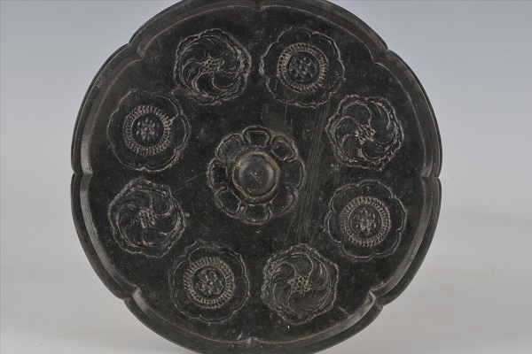 唐代照容用具,该铜镜为八瓣葵花形,圆钮有穿,可系丝带,便于把持和悬挂。花瓣形钮座,钮外饰有两种不同纹饰的宝相花图案各四朵相间环绕。宝相花,是我国传统装饰纹样之一,又称“宝仙花”、“宝花花”。盛行于隋唐时期,含有吉祥美满的寓意。