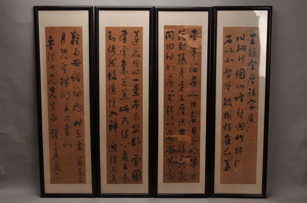 侯度四条屏每幅长170厘米,宽37.5厘米,幅中宣纸部分长116厘米,宽21.5厘米。侯度,字谨之,号断指生,清代咸丰年间人,家住滁城西大街,为人正直,嫉恶如仇。清光绪《滁州志》载其事迹:“能诗,行草得晋人意。李昭寿自陈功德,召令书石,度不从,世忠大怒,缚至,将手乃之。世忠虽暴亢,事其母谨,左右有识度者,为谋得其一言,卒断其右拇指,血注丈余,不知痛也。余姚朱侍郎蔺督皖学知其事,赠‘一节千秋'额,并赋《断指生》诗张之。度自是更号断指生,日遨游大江南北,名籍甚,所诣亦益进”。这组四条屏系行草书,流畅飘逸,最能代表侯度书风。