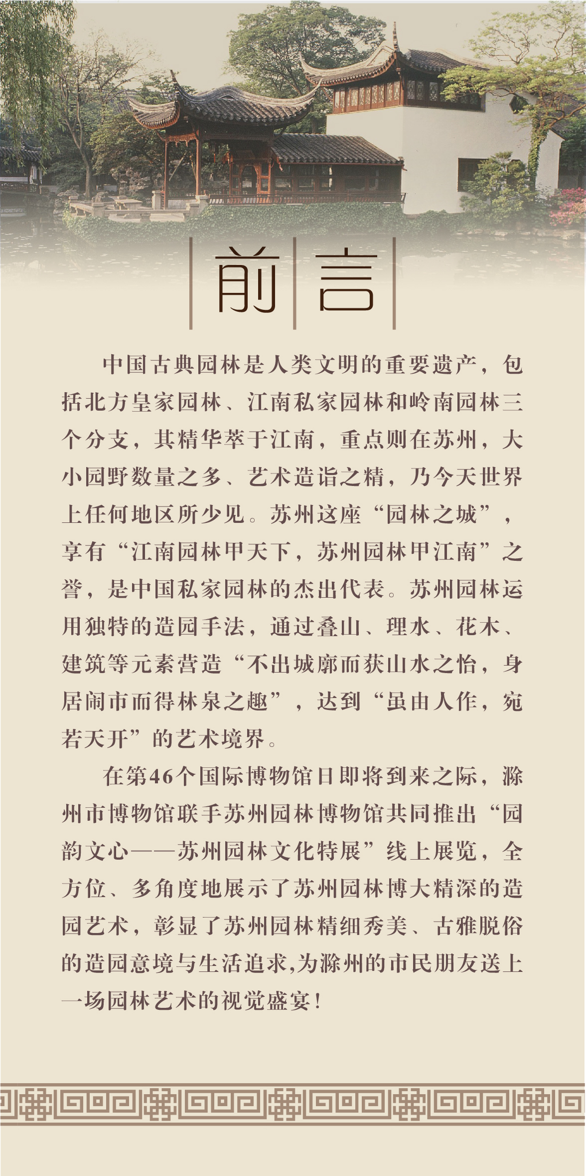 在第46个国际博物馆日即将到来之际,必威betway精装版app联手苏州园林博物馆共同推出“园韵文心——苏州园林文化特展”线上展览,全方位、多角度地展示了苏州园林博大精深的造园艺术,彰显了苏州园林精细秀美、古雅脱俗的造园意境与生活追求,为滁州的市民朋友送上一场园林艺术的视觉盛宴!