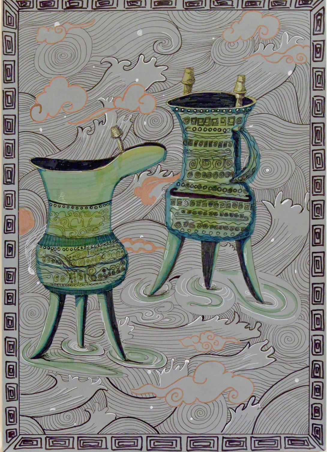 作品介绍:环形玉龙,1992年天长三角圩一号汉墓出士,国家一级文物,天长市博物馆镇馆之宝。玉龙直径4.6厘米,高0.4厘米,最大径5.3厘米。白玉质,圆形扁平体,通体镂雕成一条首尾相连、弯曲如环的龙形。龙呈张口状,上唇前伸上翘,下唇向后翻卷,双面露齿,衔尾,双角上卷。背鬓向后飘拂与龙身相连,椭圆眼带梢,龙体雕刻两卷纹。断面呈长方形,体表微凹,表面极其光滑。