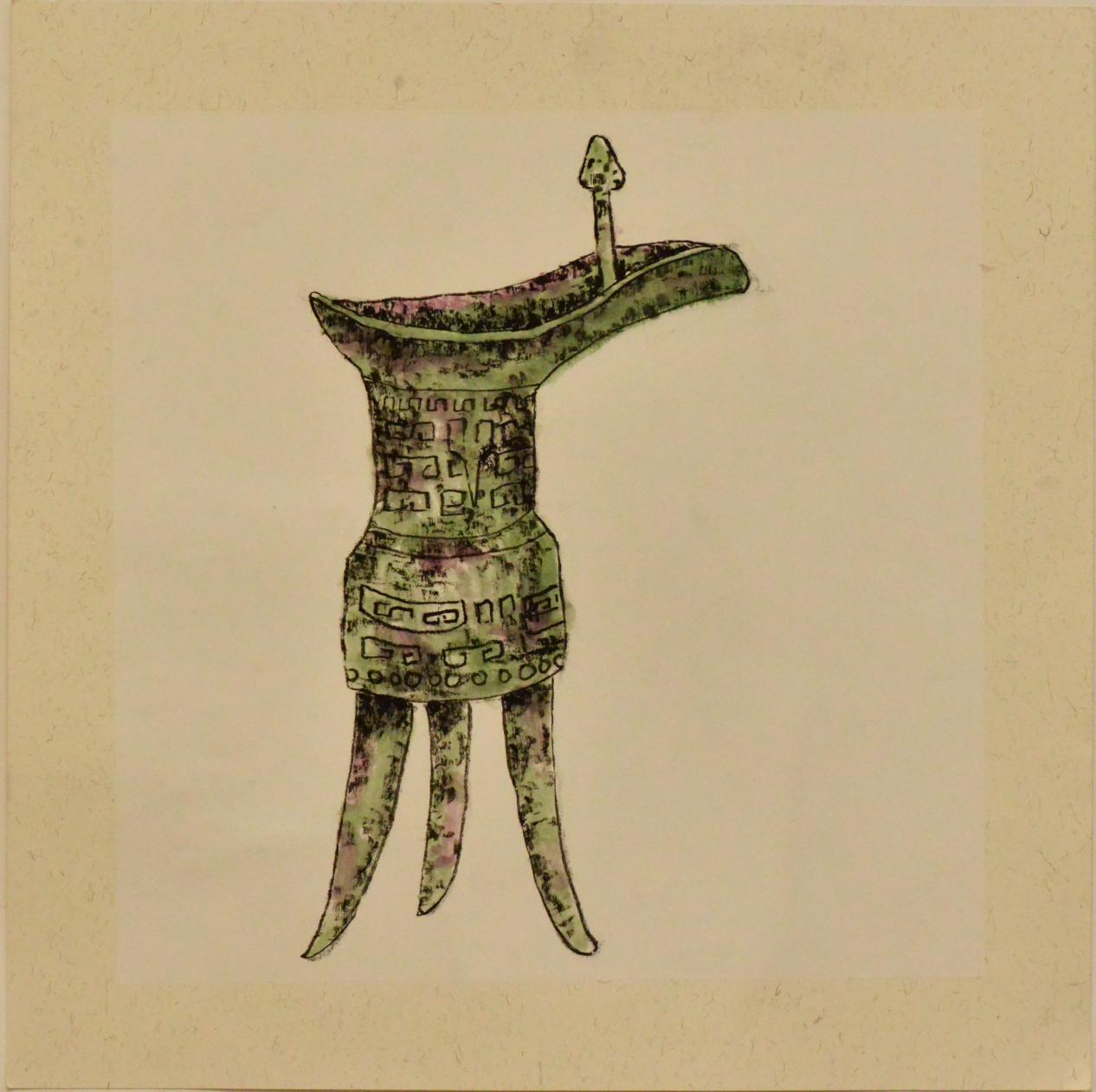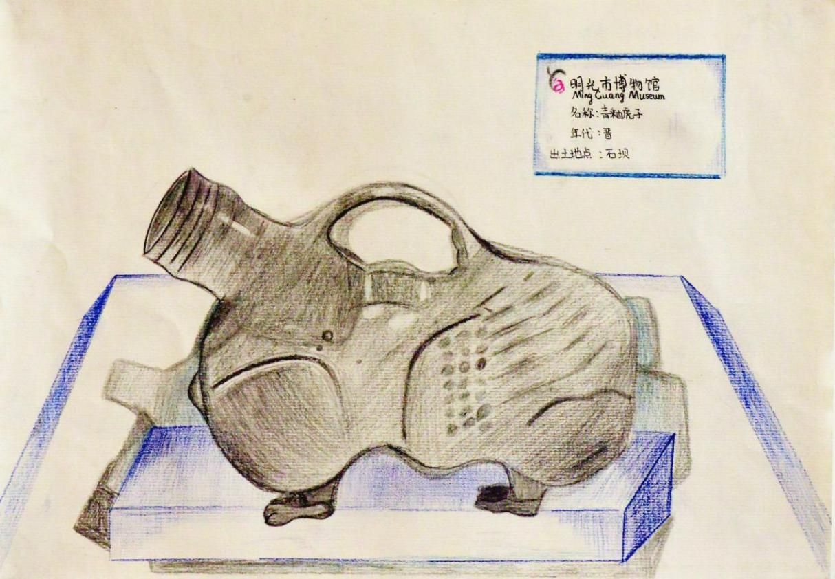 作品介绍:虎子始见于东周,流行于两汉,六朝时期最盛,隋唐时衰落。它是汉、魏、晋、南朝时期墓中常见的随葬陶瓷品之一,以青瓷虎子为多。它的用途有两说,一说是古代的溺器,一说是盛水的水器。明光博物馆馆藏的这把青釉虎子是1982年在石坝乡魏桥村出土的,全长24厘米,通高18厘米,口径6厘米。首部向前凸起上扬,呈圆形虎头状,颈上有三道弦纹,尾端露出红色胎,腹下有四个爪,两侧饰一圈羽毛,保存比较完整。