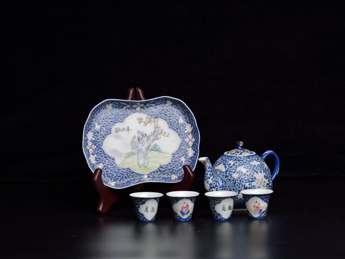 异形蓝料彩茶盘、蓝料彩缠枝壶、蓝料彩开光人物杯·近代