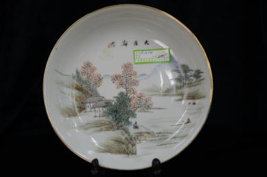 dzvkj馆藏的这件浅绛山水盘,高3.5厘米,直径18.5厘米,盘内绘制的远山近水、竹亭扁舟清淡自然,以红色和蓝色绘制的树木点缀其间,两名钓叟一于岸边、一于舟中,相映成趣,整体画面舒朗开阔,层次分明。