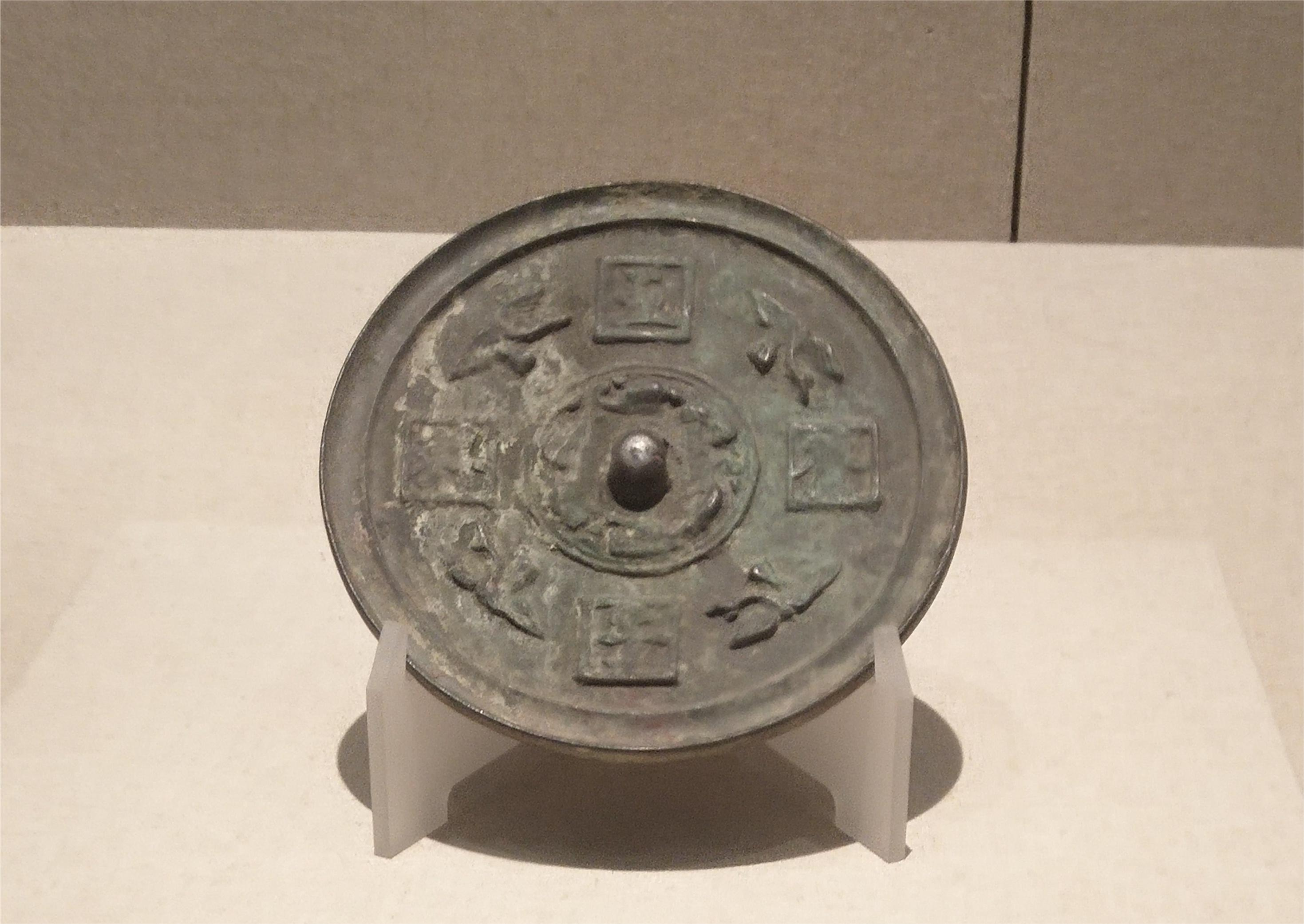 此镜为圆形,直径16厘米,缘厚0.7厘米,圆钮,钮外饰一周瑞兽纹,其外四周各置一方框,框内铭“五子登科”四字,间饰有展翅飞翔的鸿雁图案,外置一圈凸棱。