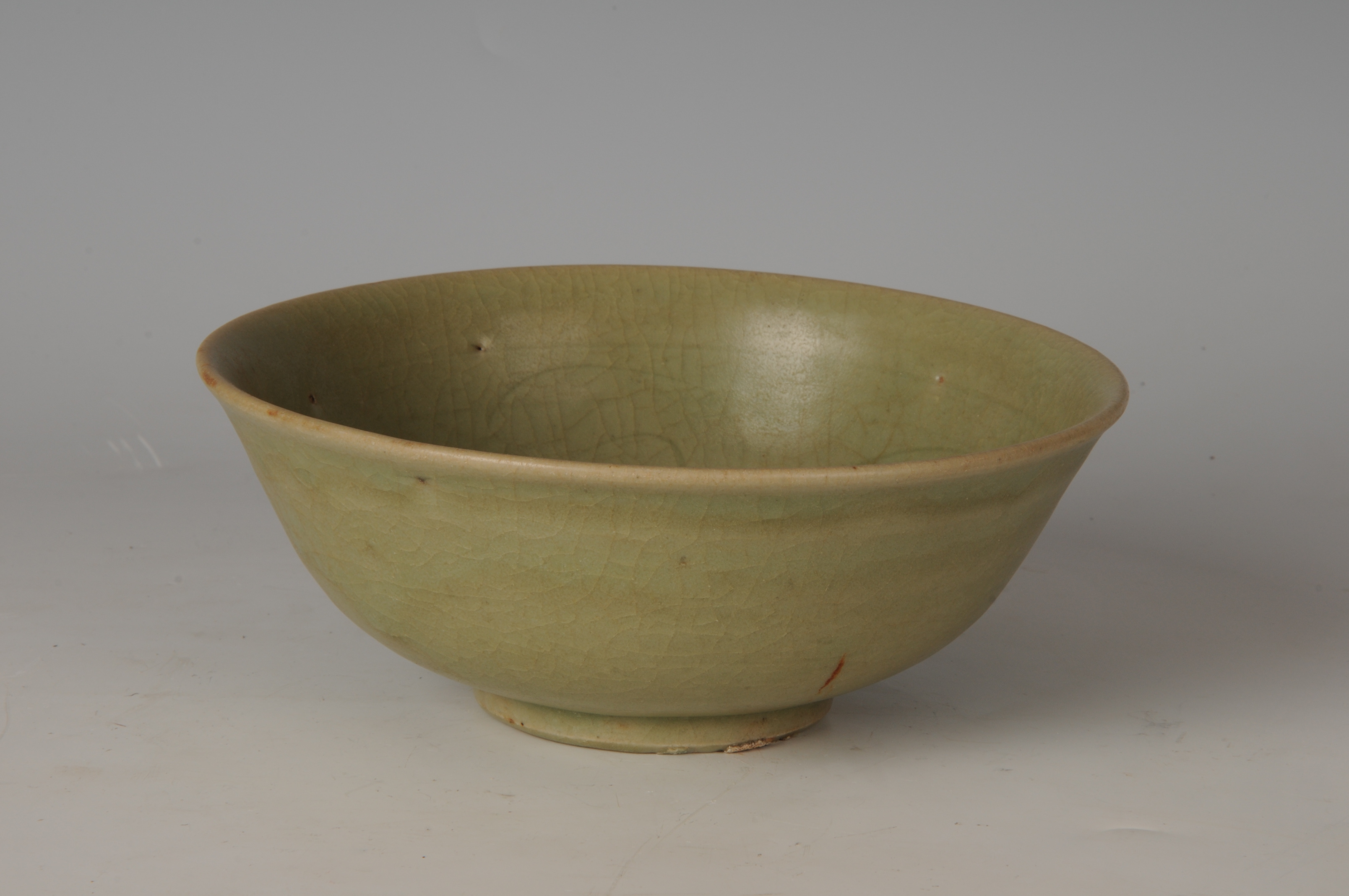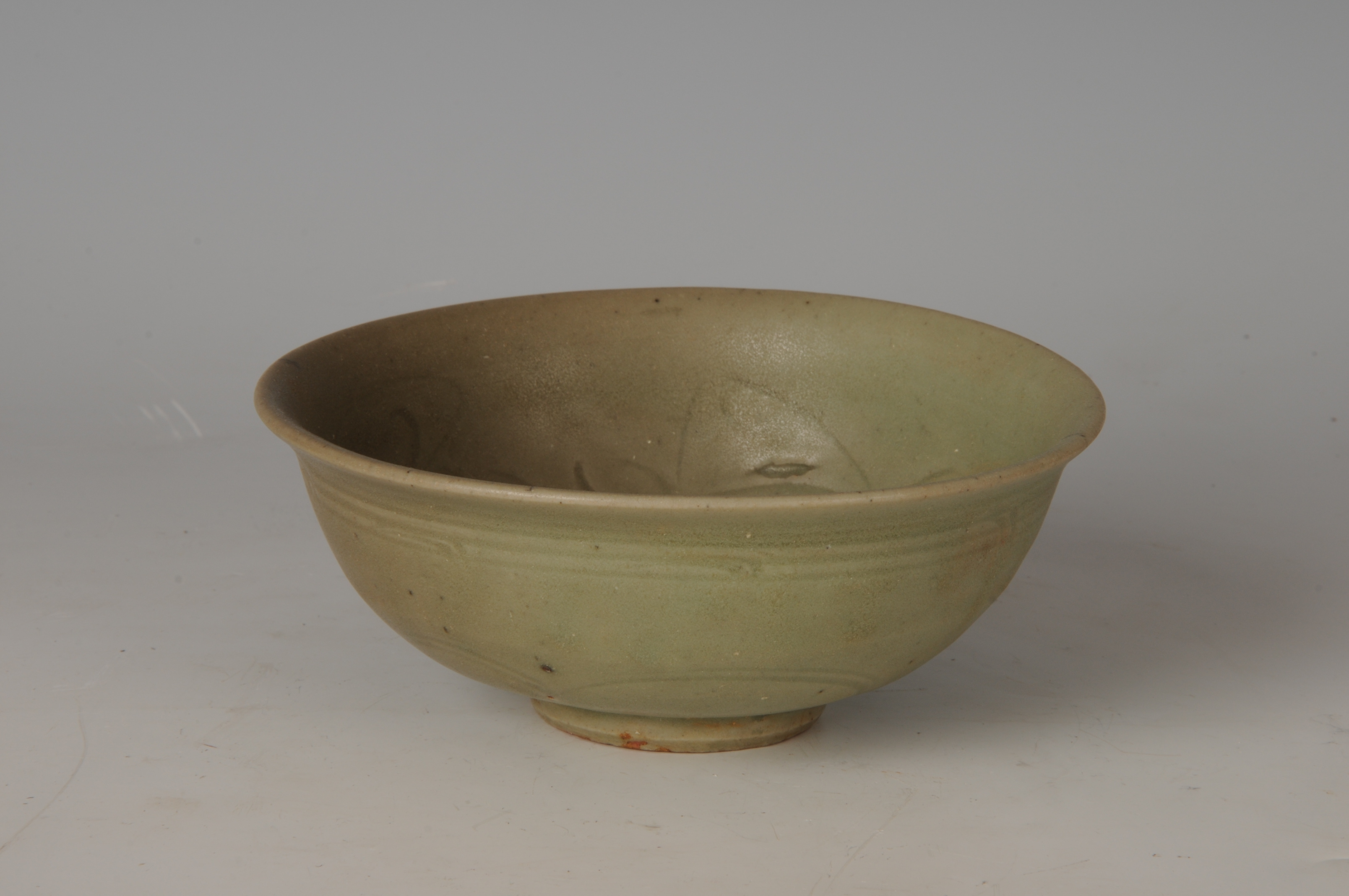 另一件口径16.2厘米,底径7.7厘米,高7.7厘米。侈口,圆弧壁,圈足,平底露胎,器身施青釉,内外壁均有划花,技法娴熟,线条流畅,外壁近口沿处饰多圈弦纹。造型质朴,釉色青绿,莹润内敛,也是一件龙泉窑的精品。